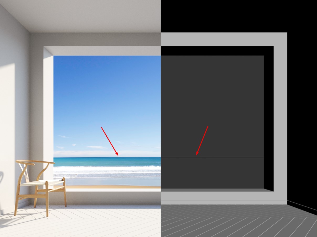 Sau đó chúng ta cứ render ảnh như bình thường, khi ghép Background trong Photoshop chúng ta sẽ kéo ảnh này vào thành 1 layer để căn cứ tinh chỉnh vị trí đường chân trời của Background khớp với đường Horizon Line này là được. Như ảnh dưới đây: