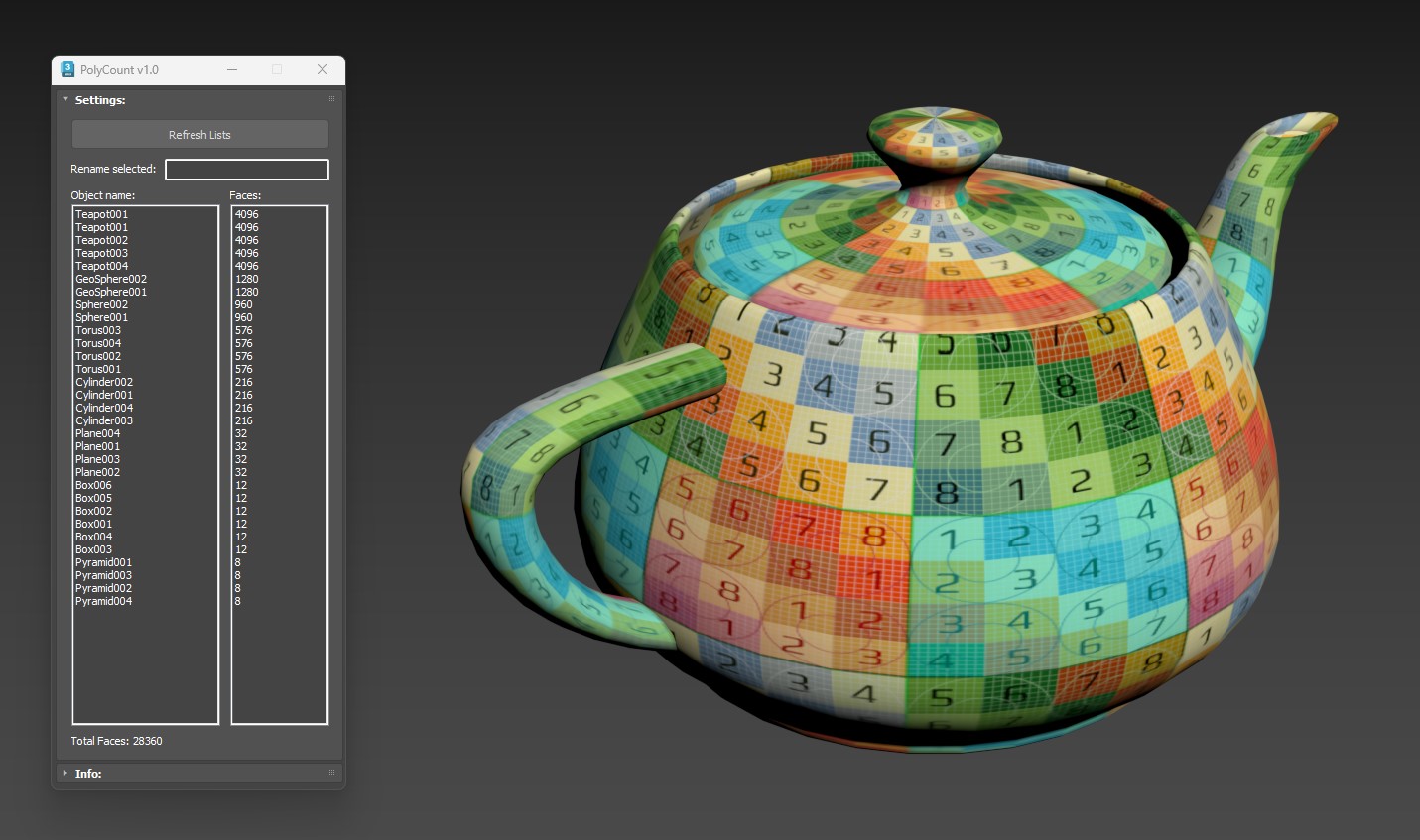 Nhờ ý tưởng này nên mình viết ra script PolyCount, nó có tính năng thống kê toàn bộ khối objects hình học trong scene với số faces (mặt) được sắp xếp từ cao đến thấp, bạn chỉ cần mở scripts, nhấn nút Refresh và một danh sách sẽ hiện ra tên của những objects top đầu chiếm tài nguyên máy tính và tống số mặt đa giác của toàn bộ scene nữa.